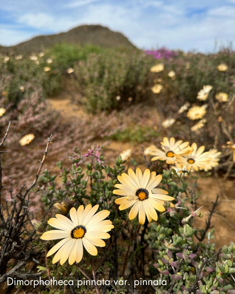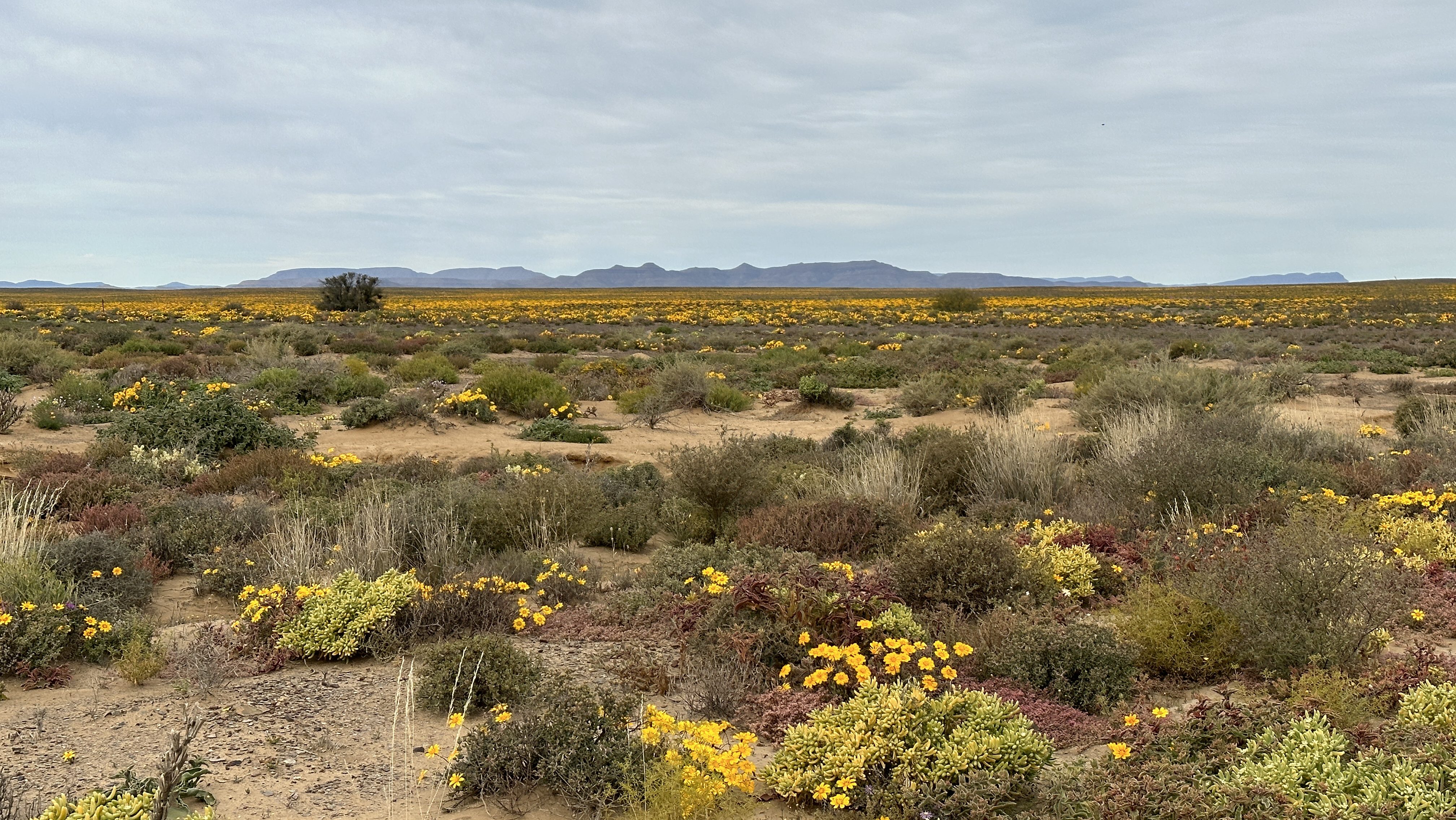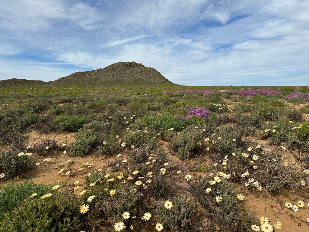 This year has had an unprecedented amount of rainfall, and not just in the winter. Exceptional rains in December (summer) caused sections of the R355 to be completely washed away. The Doring River now is surging with “turbid water” (meaning of the Sonqua word, Tankwa) from rains this winter. This has caused a spring super-bloom of wildflowers splashing vibrant colour across the usually dry and stony landscape.