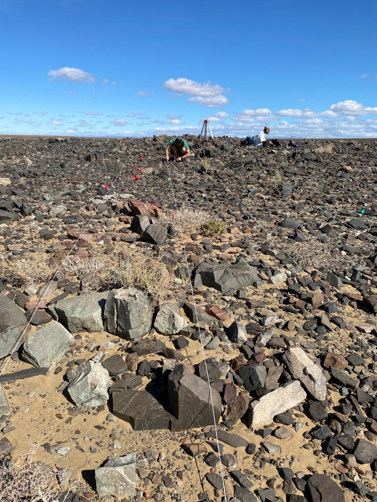 The aim of our fieldwork was to return to our previous study site Tweefontein (see our 2020 PloS ONE paper for details) to gather new 3D scan data for artefacts over a larger area. Beginning at the densest part of the surface artefact scatter, we laid out a grid of 1 m transects from which we sampled our stone tools.