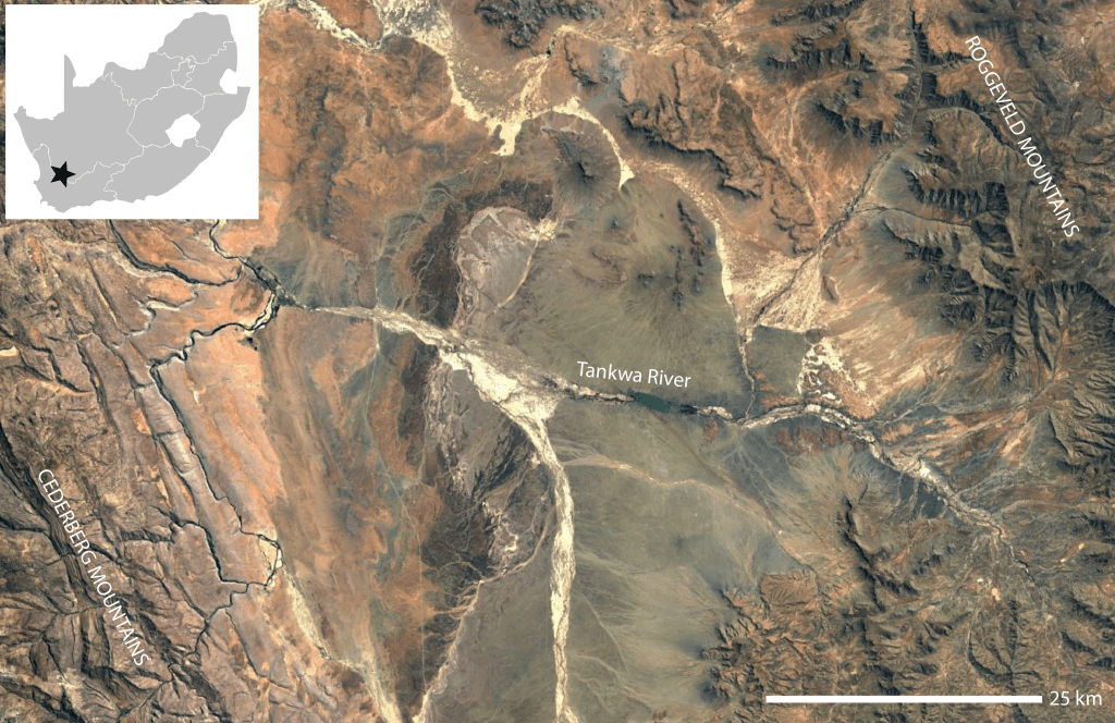 The Tankwa Karoo is a small basin marking the south-western extent of the Karoo. It is bounded by mountains: the Cederberg to the west, Roggeveld to the east, Koubokkeveld to the north and Koedoesberge and Klein Roggeveld to the south. The effect of these mountains on incoming air masses gives it a particular climate with desert temperature extremes of hot days and cold nights and very low rainfall – less than 75 mm a year, falling mostly in the winter.